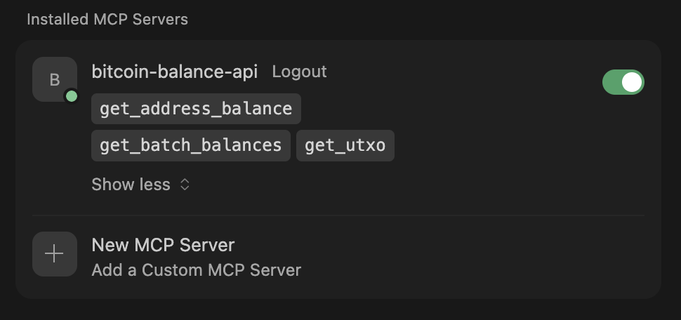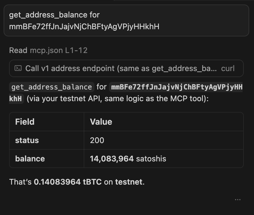 Our MCP server allow's you to connect your development tools and AI tools to connect directly to our  infrastructure. This allows you to integrate anything Bitcoin Balance related to be used in your workflow.